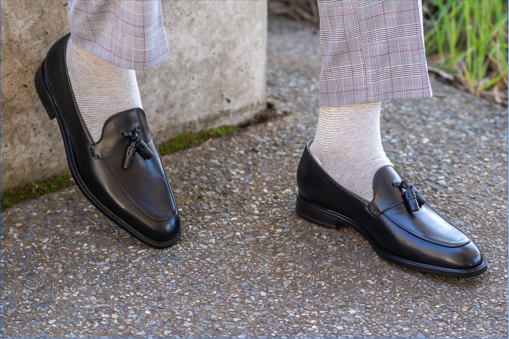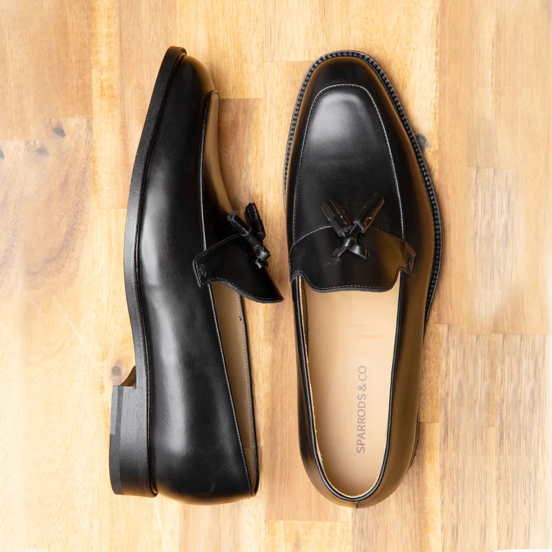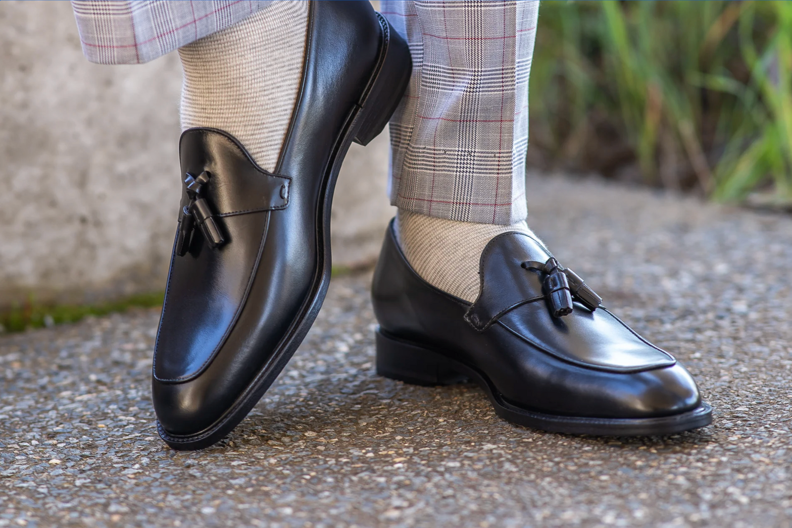 The Albert is an all season, contemporary mens tan loafers, suitable for all but the most formal occasions boasting of sleek silhouette. It can be dressed up or down, making it a versatile choice. The tassels on the vamp add a touch of personality and whimsy, while the overall design is sleek and understated. It is beautifully crafted in Portugal using box calf and fully lined with soft calf leather for amazing comfort. The vegetable tanned leather sole is easily resoled by any Cobbler.